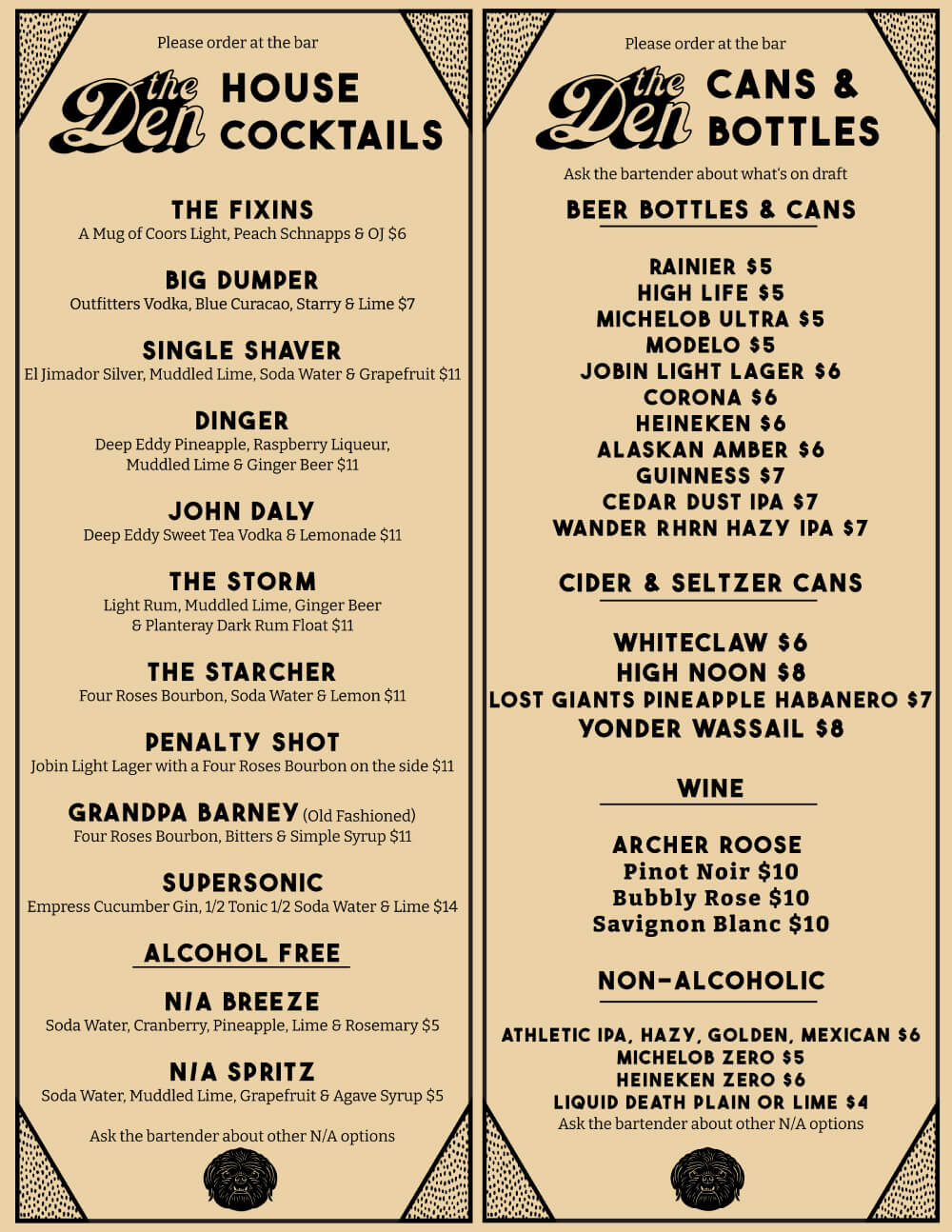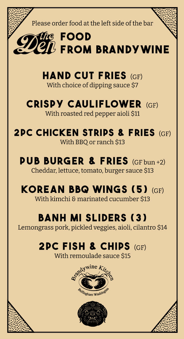 Order your food at the Den and it will be delivered to you where you are seated from our neighbors at Brandywine Kitchen!